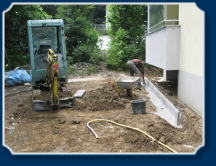 Um den Sockel vor Spritzwasser zu schützen, bauen wir hier nach dem Zuschütten und Verdichten einen Kiesstreifen um das Haus herum