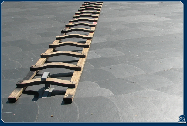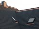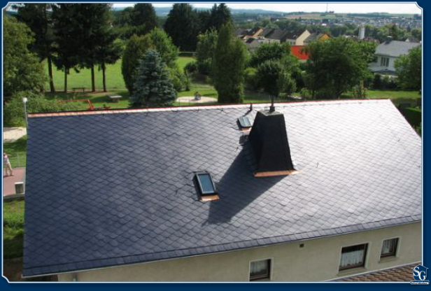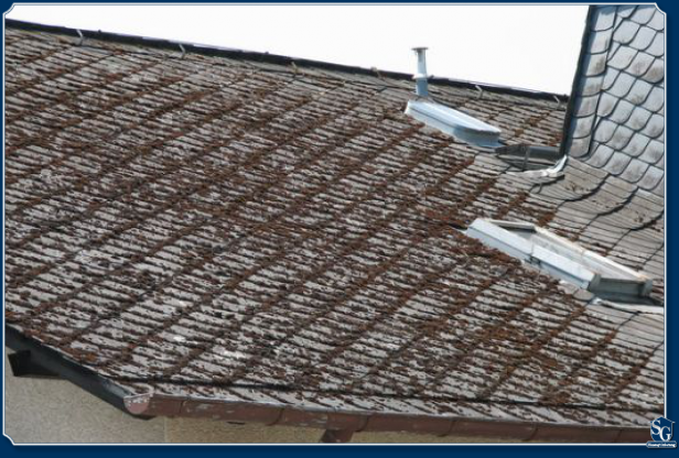 Ein fertig montiertes Moos-Stopp-System auf einem blauen Kunstschieferdach