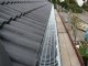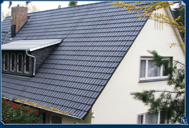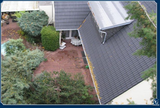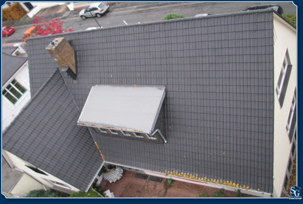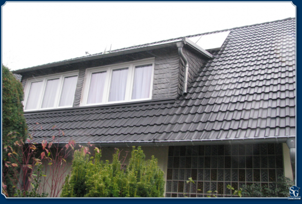 Hier sieht man den Unterschied: Oben in der Gaubenrinne liegt das Laub und untern bleibt es davor auf dem Dach liegen.