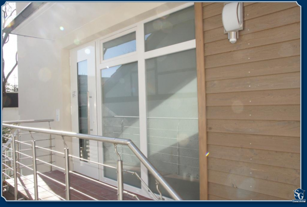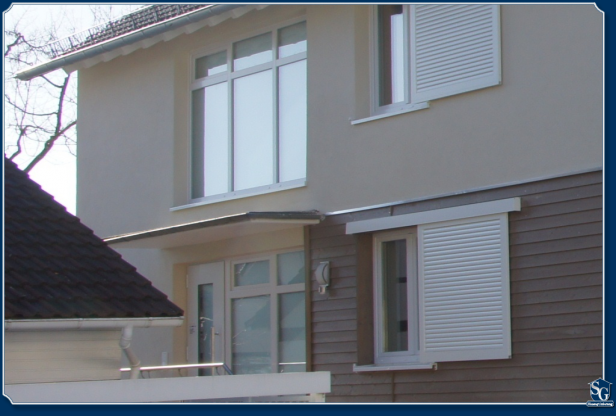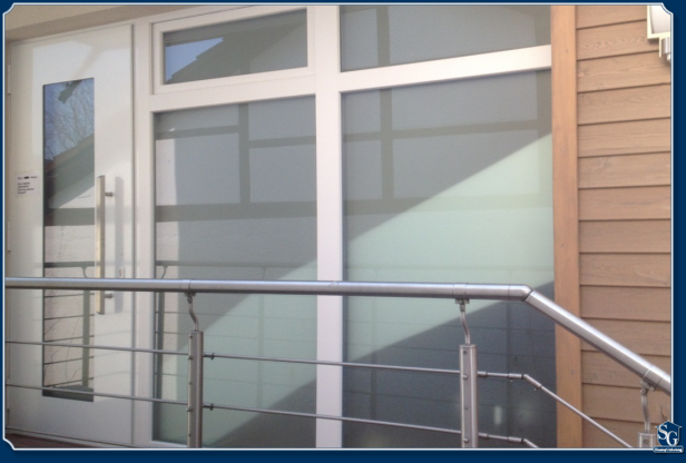 Satinato-Glas in Fenster und Türen vor dem Treppenhaus