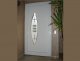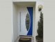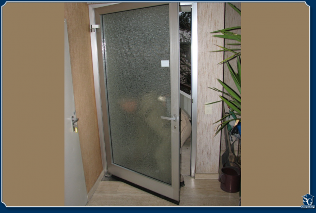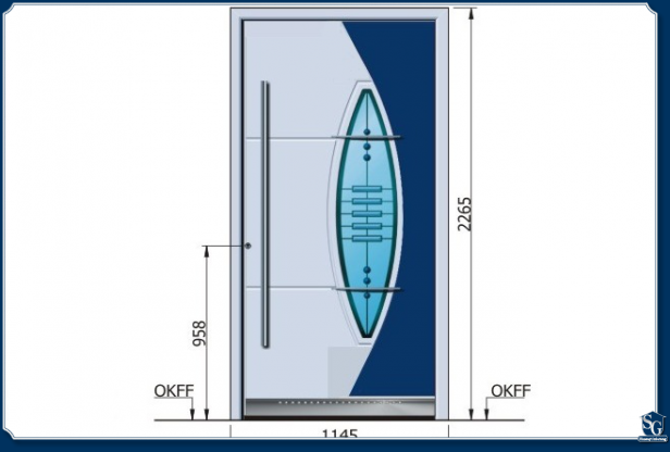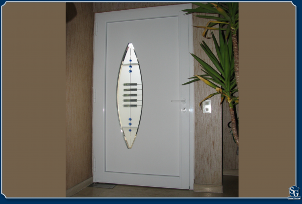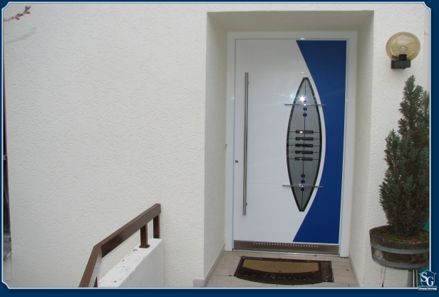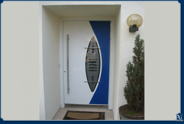 Eine thermisch getrennte Aluminiumtür, pulverbeschichtet, Glasmotiv, Applikationen in blau und in Edelstahl